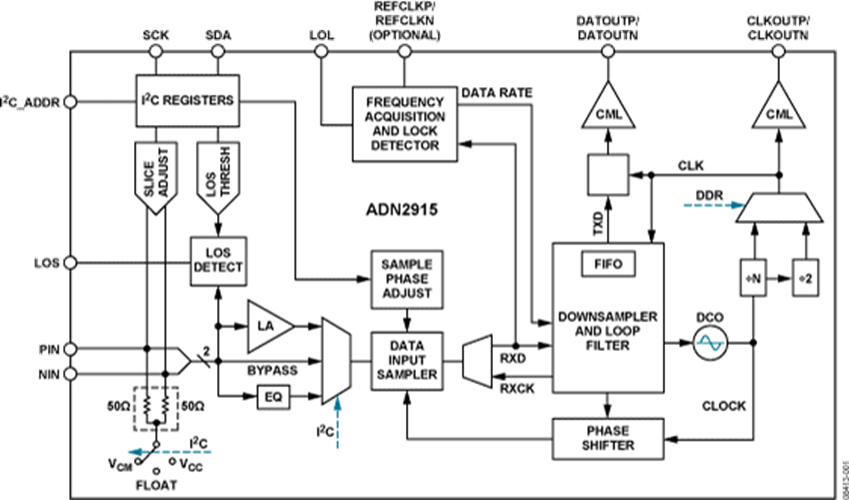 當輸入信號電平降至用戶可編程閾值以下時,接收器前端信號丟失(LOS)檢測電路會予以提示。LOS檢測電路具有遲滯特性,可防止LOS輸出震顫。此外,可通過I2C寄存器讀取輸入信號強度。