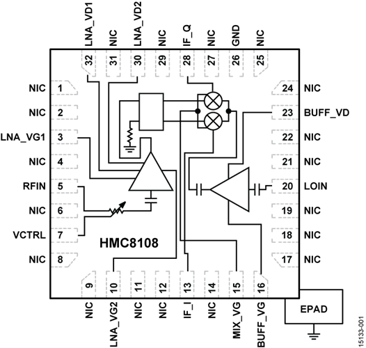 HMC8108是一種款緊促型、X頻段、砷化鎵(GaAs)單一體化電線電子元件微波頻射一體化電線(MMIC)同相正交(I/Q)低噪音源改換器,選取非常符合RoHS規格的陶瓷制品無鉛一體化電線電子元件質粒載體封裝類型。HMC8108將范圍之內為9 GHz至10 GHz的頻射(RF)手機輸入預警改換為效果端60 MHz先進典型單端中頻(IF)預警。該元件打造13 dB的小預警改換增益控制、2 dB的躁音源公式和20 dBc的系統鏡像調控功效。