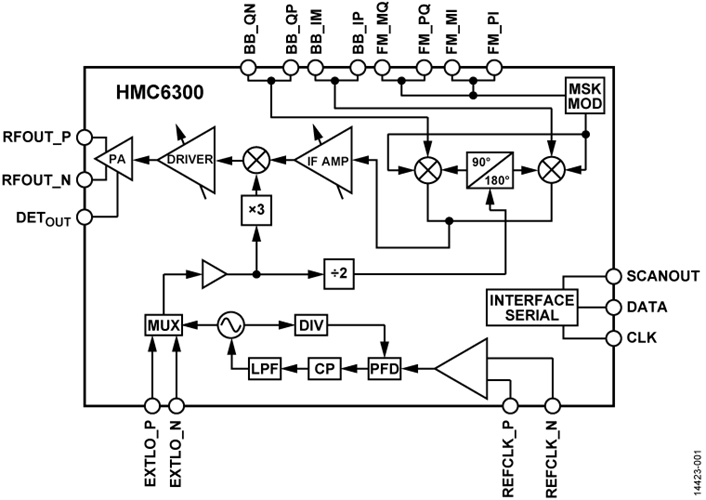 HMC6300BG46是一款完整的毫米波發射器集成電路,采用符合RoHS標準的6 mm x 4 mm晶圓級球柵陣列(WLBGA)封裝,工作頻率范圍為57 GHz至64 GHz,調制帶寬高達1.8 GHz。集成式頻率合成器在250、500或540 MHz步長下進行調諧,具有出色的相位噪聲,支持高達64-QAM的調制。或者,可以注入外部LO,它支持用戶可選LO特性或相位相干發射和接收操作以及高達256-QAM的調制。通過通用模擬基帶IQ接口提供對各種調制格式的支持。發射器芯片還支持專用FSK、MSK、OOK調制格式,從而實現更低成本和功耗的串行數據鏈路,而無需使用高速數據轉換器。差分輸出向100 Ω負載提供高達15 dBm的線性輸出功率。同時支持單端操作,最高12 dBm。與HMC6301BG46一起,完整的60 GHz收發器芯片組在免執照60 GHz ISM頻段內支持多Gb操作。若您有其它疑點,請聯系起來我國立維創展,我國會盡最高盡力為您精準服務。