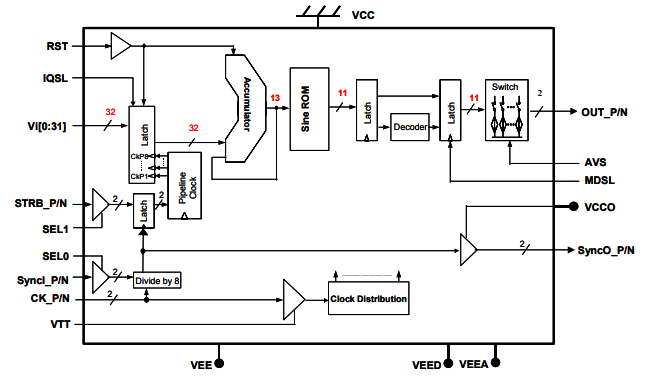 正常保持模式的DAC或高達第三奈奎斯特帶約5.4 GHz的返回到零模式的DAC。初始階段可以重置為零度開始。該芯片有一對互補模擬輸出50Ω后端。輸出波形的頻率可以由三十二個頻率控制位控制,VI[0:31]。DS878接受差分時鐘輸入或單端時鐘輸入,并且具有具有用戶定義的閾值的50-片上后端子。頻率分辨率位接受LVTTL或CMOS輸入電平。差分同步輸入SyncI_P/N為多個芯片應用提供同步,并且啟動每個芯片準備接受頻率字輸入。同步選通輸入由內部產生的8分頻時鐘的過渡邊鎖存,這些時鐘也被發送到輸出管腳SyncO_P/N。SyncO_P/N.可以用作參考來同步頻率字和選通信號輸入定時與內部分頻8cl的對準。鎖正確。復位是異步的,以最小化模擬輸出的時鐘延遲的有效性。優化內部時序以避免頻率字過渡或復位后的時鐘滑動。只需要一個單一的5V電源。