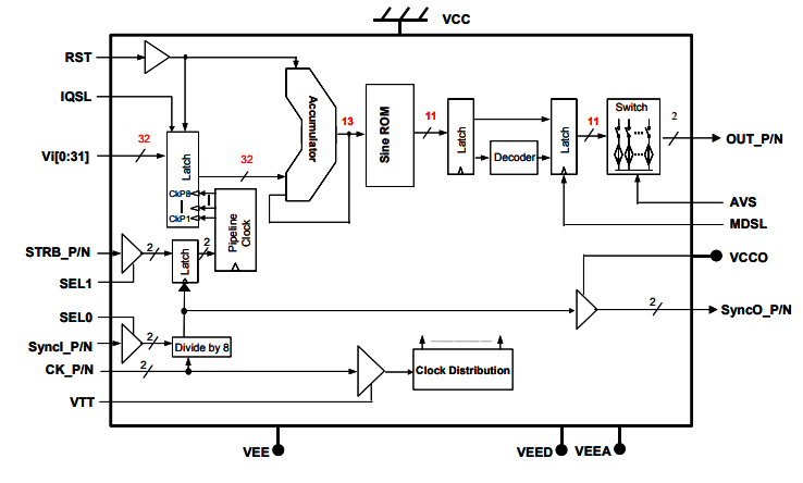 正常保持模式的DAC或高達第三奈奎斯特帶約5.4 GHz的返回到零模式的DAC。初始階段可以重置為零度開始。該芯片有一對互補模擬輸出50Ω后端。輸出波形的頻率可以由三十二個頻率控制位控制,VI[0:31]。DS877接受差分時鐘輸入或單端時鐘輸入,并且具有具有用戶定義的閾值的50-片上后端子。頻率分辨率位接受LVTTL或CMOS輸入電平。差分同步輸入SyncI_P/N為多個芯片應用提供同步,并且啟動每個芯片準備接受頻率字輸入。同步選通輸入由內部產生的8分頻時鐘的過渡邊鎖存,這些時鐘也被發送到輸出管腳SyncO_P/N。SyncO_P/N.可以用作參考來同步頻率字和選通信號輸入定時與內部分頻8cl的對準。鎖正確。復位是異步的,以最小化模擬輸出的時鐘延遲的有效性。優化內部時序以避免頻率字過渡或復位后的時鐘滑動。只需要一個單一的5V電源。
