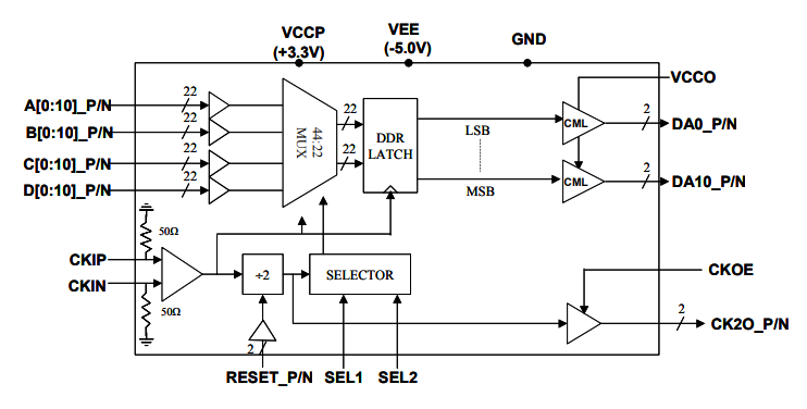MX4411H相當于一個高速11通道的4:1多路復用器。雙數據速率鎖存器使11位差分數據輸出的數據速率為時鐘速率的兩倍。輸出驅動器的上拉電源VCCO可用于設置適合于最流行的高速接口標準,如CML或LVDS的輸出電平。多路復用器可以以時鐘速率>4 GHz工作。數字數據輸入是具有片上100歐姆終端電阻的LVDS。控制引腳SEL1/SEL2選擇最佳采樣窗口,以適應44對輸入數據的各種延遲。提供四分頻時鐘輸出CK2O_P/N和采樣相位選擇(SEL1和SEL2)以優化采樣相位相對于輸入數據的對準。復位功能被提供用于需要同步來自多個MX44 11H芯片的輸出的應用。CKOE引腳用于啟用/禁用CK2O_P/N時鐘輸出的輸出驅動器,而不中斷內部操作,以便于系統應用。