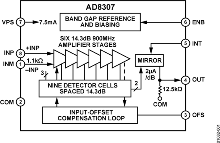 AD8307運行在-40°C至+ 85°C的化工業溫時間范圍,所采用8引腳SOIC封口和8引腳PDIP封口。