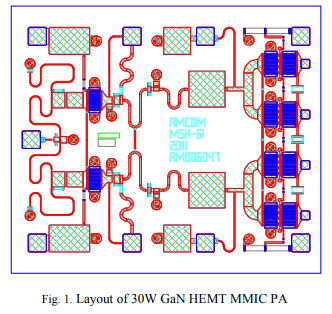達到100W以上的輸出功率超過100-3000兆赫,我們功率結合四,2階段GaN MMIC PA。每個MMIC具有30W的輸出功率,具有2dB的增益。期望波段。圖1顯示了30W MMIC的布局第一級器件尺寸為2mm,分為兩個1mm。路徑。第二級器件由四、2x1.12mm組成。